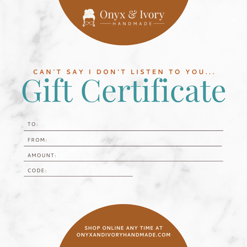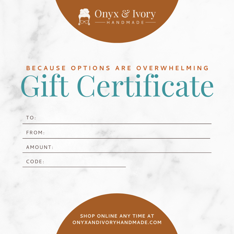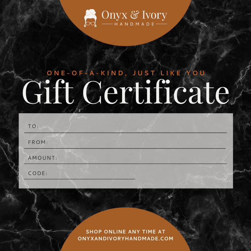 Custom order inquiries can be sent to onyxandivoryhandmade@gmail.com. Please include a brief description of what you're looking for, when you need the items by and your budget.